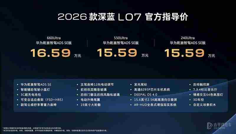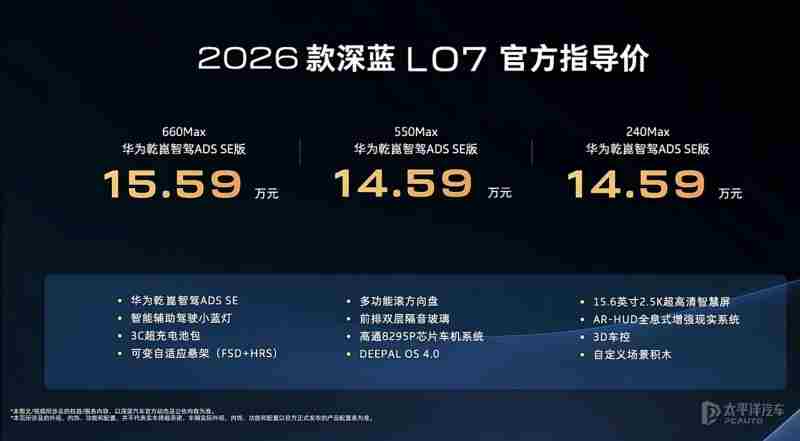 【太平洋汽车 新车频道】8月13日,2026款深蓝L07(询底价|查参配)正式上市,新车共推出6款车型,售价区间为14.59-16.59万元,限时享5999元抵扣15999元智享膨胀金,限时售价13.59-15.59万元。作为改款车型,新款深蓝L07针对辅助驾驶、智能座舱、舒适性配置、续航、底盘等方面进行了升级,全系标配华为乾崑ADS SE版,升级高通骁龙8295P芯片,提供增程和纯电可选,标配FSD+HRS可变自适应悬架。