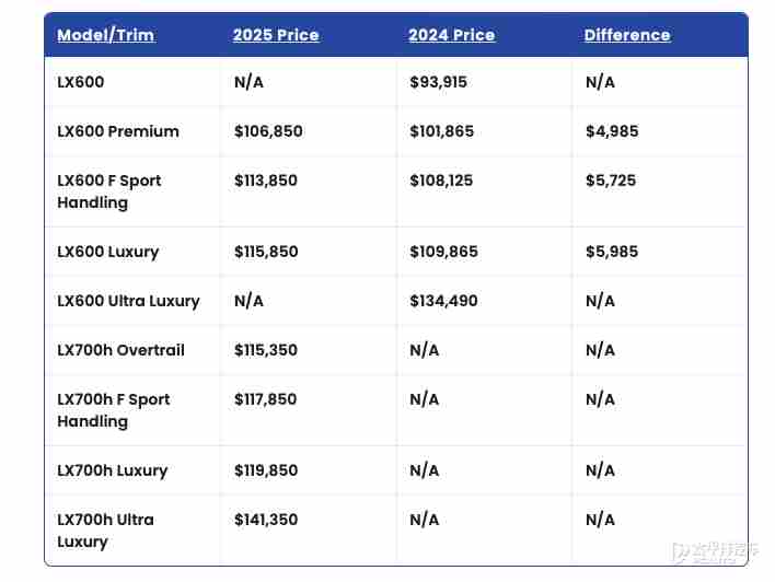 【太平洋汽车 新车频道】日前,雷克萨斯在美国市场推出了2025款雷克萨斯LX(询底价|查参配),共推出7款配置车型,售价区间为106850-141350美元(约合人民币77.8-102.9万元),相比2024款车型增加了3款配置,并取消入门版车型,起售价上涨12935美元(约合人民币9.4万元),同时全系标配雷克萨斯安全系统增强版3.0。作为参考,雷克萨斯LX在国内售价区间为125.00-155.00万元。