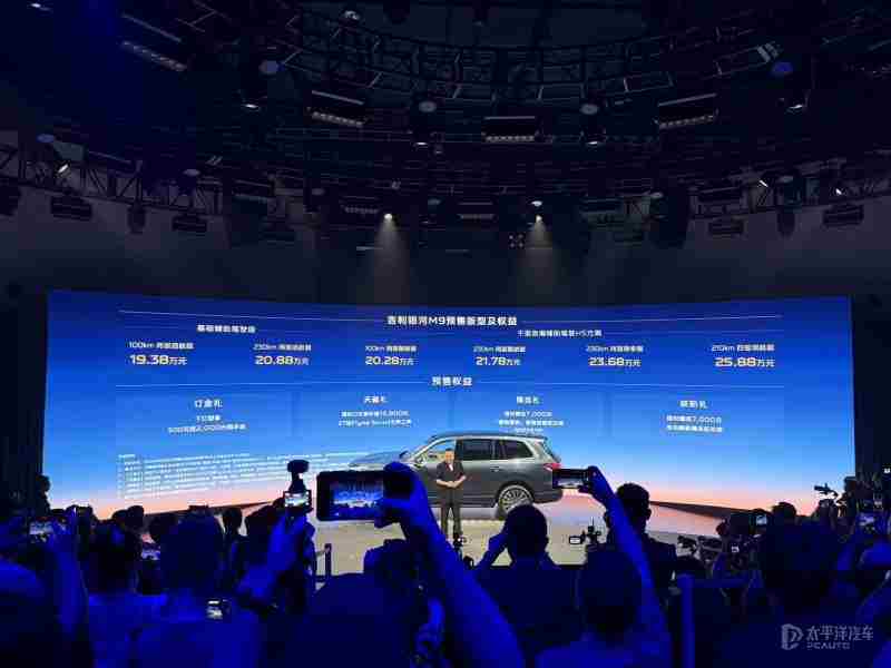 【太平洋汽车 新车频道】9月4日,从吉利银河汽车官方获悉,旗下全新SUV银河M9(询底价|查参配)将于9月17日正式上市,该车已于8月23日完成预售,共推出6款车型,预售价为19.38-25.88万元,预售24小时订单超4万台。银河M9定位于大型SUV,全系采用6座布局,搭载1.5T插混系统,匹配3挡DHT变速箱,百公里加速最快4.5秒,CLTC纯电续航最高230km,CLTC综合续航超1500公里,并搭载千里浩瀚H5辅助驾驶系统。