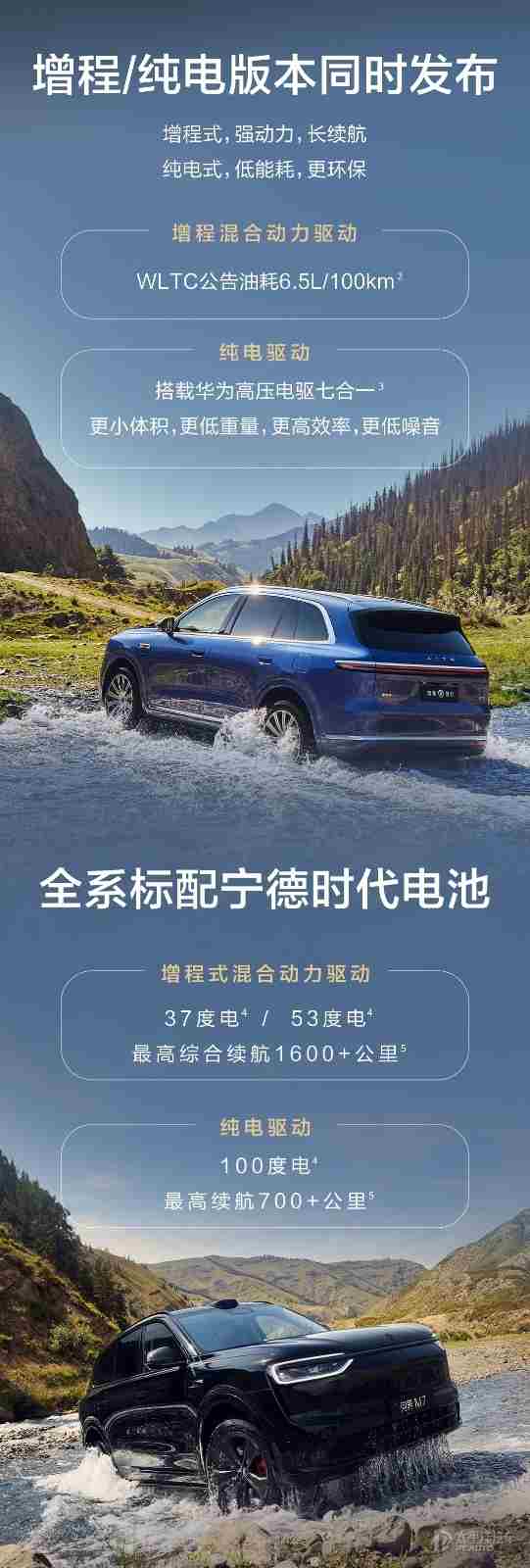 最后在动力方面,全新问界M7将提供增程版和纯电版可选,其中增程版搭载1.5T增程器,最大功率118千瓦,提供两驱和四驱可选,两驱版驱动电机最大功率227千瓦;四驱版前后驱动电机分别为165千瓦和227千瓦,综合功率392千瓦,最高车速可达200km/h。续航方面,提供容量为37千瓦时和53千瓦时电池组可选,CLTC综合续航1600km。