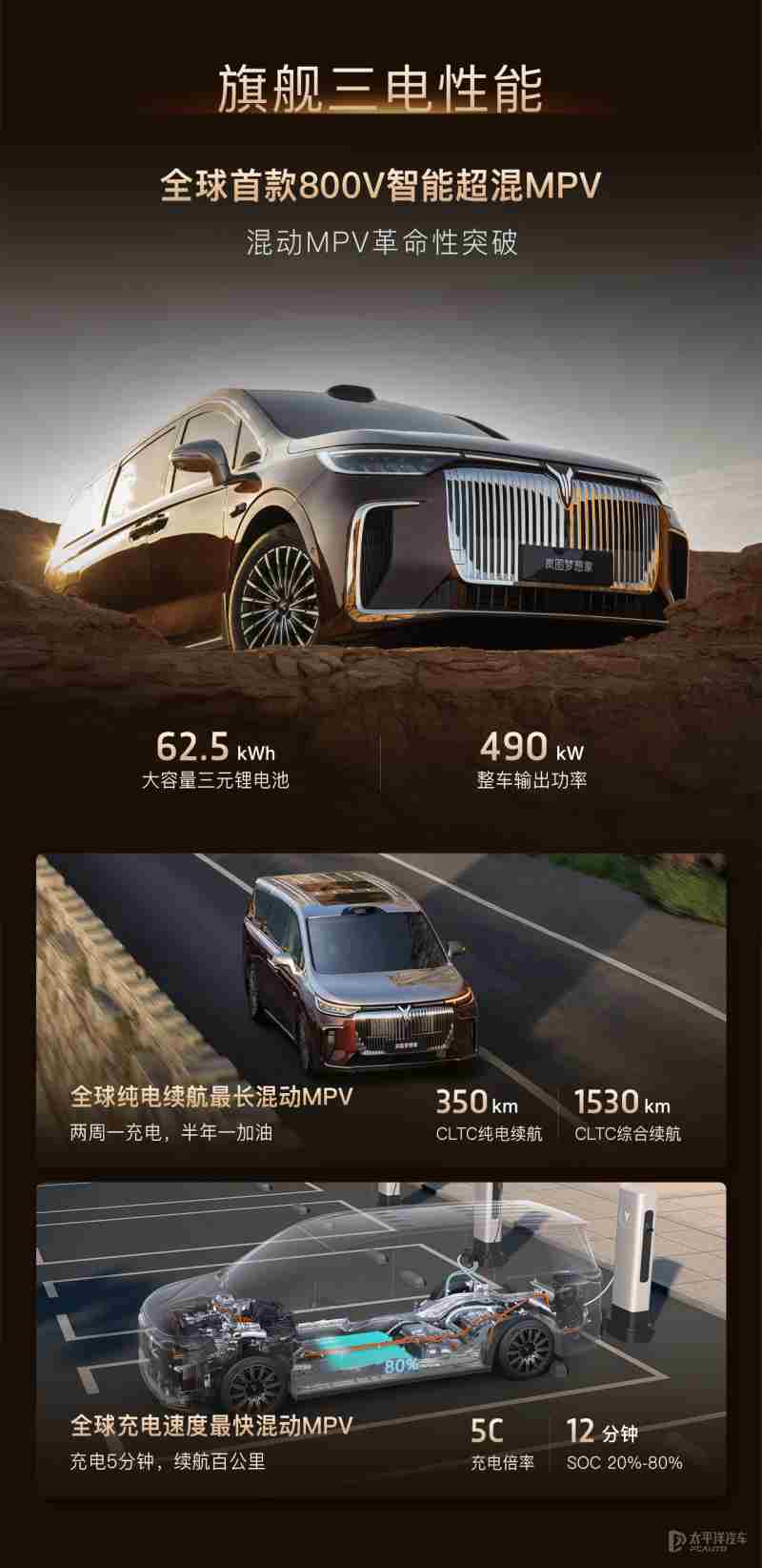 插混版纯电续航350公里,综合续航1531公里,63千瓦时电池组,支持5C超充,SOC由20%充至80%需12分钟。(文:太平洋汽车 彭浚哲)