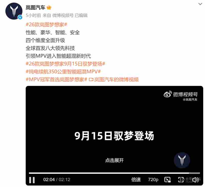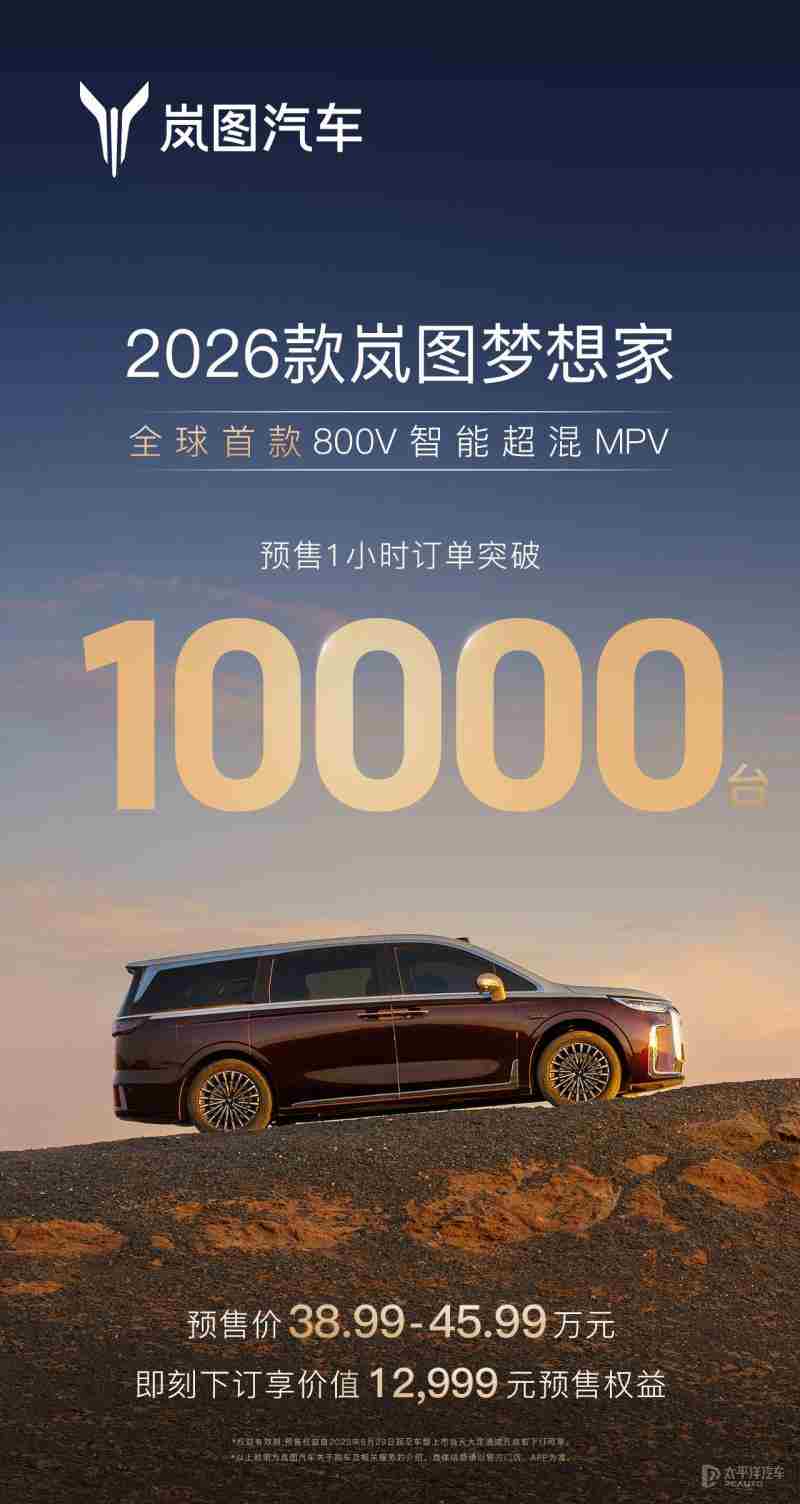 【太平洋汽车 新车频道】9月8日,我们从岚图汽车官方获悉,2026款岚图梦想家将于9月15日上市,新车已在成都车展上开启预售,预售价区间38.99-45.99万元。