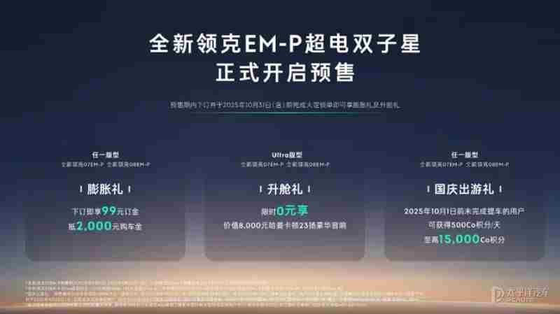 【太平洋汽车 新车频道】近期,新款领克07 EM-P、全新领克08(询底价|查参配) EM-P正式开启预售,预售期内下订并于2025年10月31日(含)前完成大定锁单即可享膨胀礼及升舱礼,其中膨胀礼为99元订金抵2000元购车金,升舱礼为Ultra版型限时限时0元享价值8000元哈曼卡顿23扬豪华音响。
