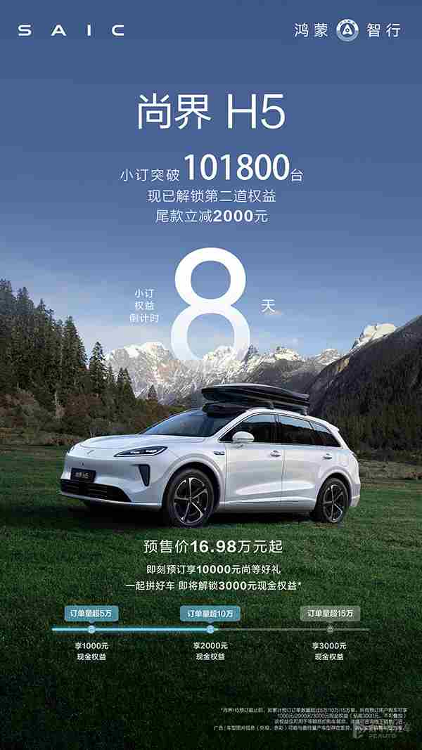 【太平洋汽车 新车频道】 9月15日,尚界汽车官方宣布尚界H5(询底价|查参配)小订突破101800台,权益翻倍,目前可享2000元现金权益。据悉,尚界H5共推出6款车型,预售价区间为16.98-20.98万元,车辆将于9月23日正式上市。作为鸿蒙智行与上汽集团联合打造的首款车型,尚界H5定位中型SUV,轴距2840mm,提供增程和纯电动力,纯电版CLTC续航655km,增程版综合续航1300km,同时还搭载华为ADS 4和鸿蒙座舱。