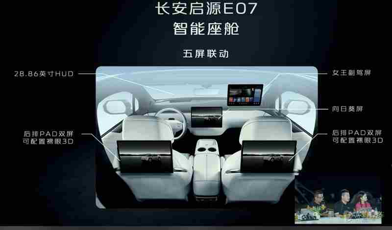 在配置方面,新款长安启源E07标配9安全气囊、540度全景影像、电动后备箱、自适应远近大灯、全景天幕、前后多层隔音玻璃、方向盘加热/记忆、28.8英寸AR-HUD抬头显示、50W手机无线充电、前排座椅加热/通风/按摩、前排零重力座椅、18扬声器音响、256色氛围灯和智能香氛系统等豪华配置。