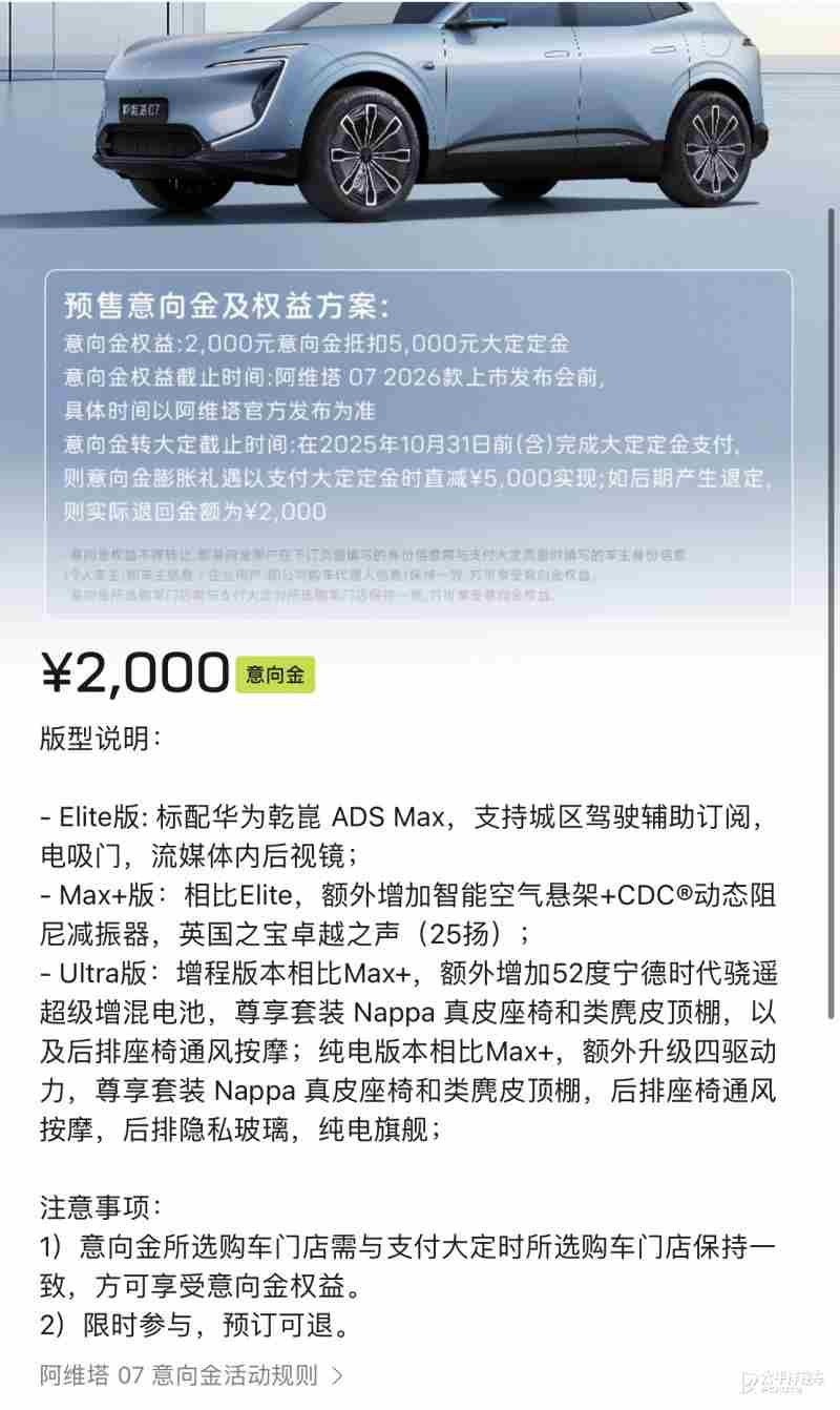 【太平洋汽车 新车频道】9月4日,2026款阿维塔07开启预售,新车共推出6款车型,不过并未公布预售价,而是提供2000抵5000限时权益预。作为改款车型,新款阿维塔07(询底价|查参配)新增晴蓝外观配色、岩棕内饰配色、辅助驾驶小蓝灯、流媒体内后视镜、智能冷暖冰箱等配置,并全系标配华为乾崑ADS 4和鸿蒙座舱5,动力上继续提供增程和纯电可选,其中增程版新增52千瓦时5C电池组,CLTC纯电续航330km,综合续航超1200km。