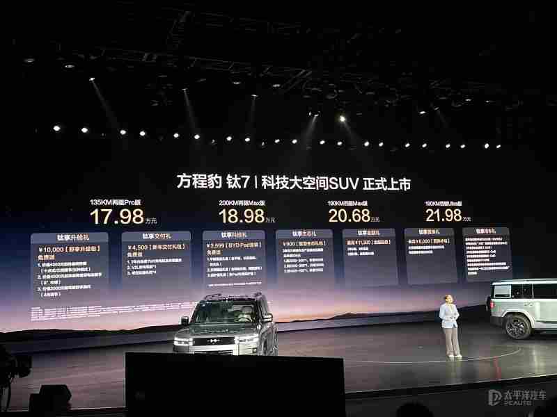 【太平洋汽车 新车频道】9月9日,方程豹钛7(询底价|查参配)正式上市,新车共推出4款车型,售价区间为17.98-21.98万元,其中顶配版还可选装比亚迪车载无人机系统。作为方程豹钛系列第二款车型。钛7定位中大型5座SUV,采用承载式车身结构,搭载1.5T插混系统,CLTC纯电续航最高200km,同时还配备前双叉臂后五连杆悬架、云辇、天神辅助驾驶三目版等豪华配置,并首搭比亚迪新一代智慧生态。