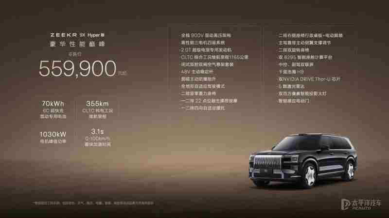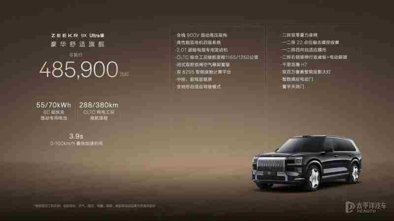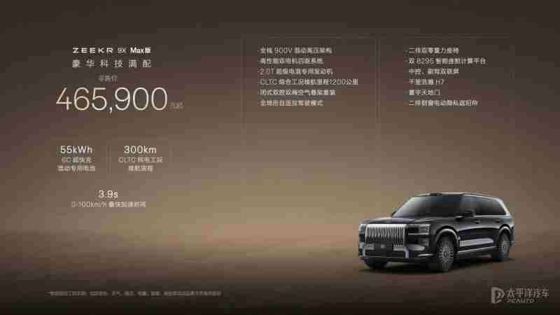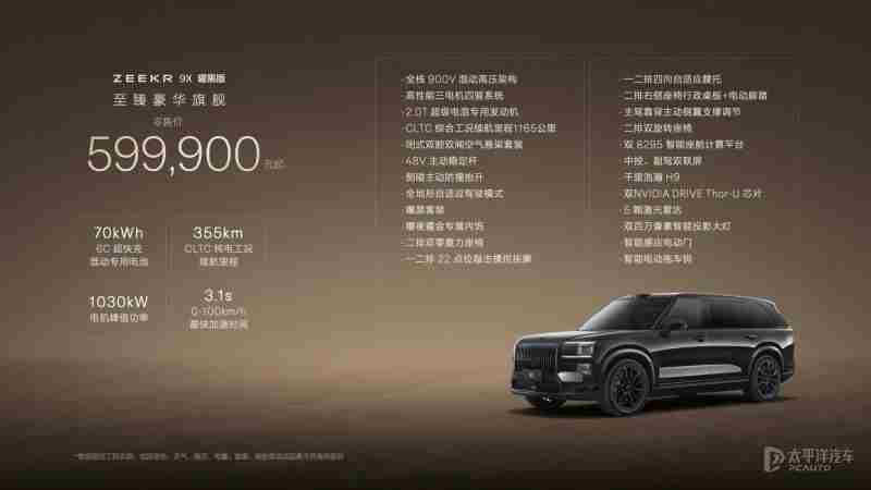 【太平洋汽车 新车频道】9月29日,极氪9X正式上市,新车共推出4款车型,售价区间为46.59-59.99万元。作为极氪首款插混车型,新车定位大型SUV,搭载2.0T插混系统,提供双电机版和三电机版可选,电动机总功率最高1030千瓦,百公里加速3.1秒,CLTC纯电续航最高380km,并配备双腔闭式空气悬架、双阀CCD电磁减振系统和48V主动稳定杆。此外,新车还搭载千里浩瀚H9辅助驾驶方案,配备5颗激光雷达和双英伟达Thor芯片。据官方表示,Max版和Ultra版上市即交付,Hyper版计划11月下旬开启交付。