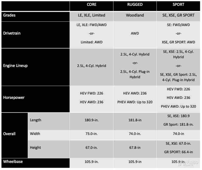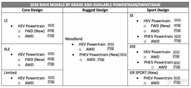 全新一代RAV4将提供Core, Rugged, Sport三种不同设计共七个配置,动力形式上可选择油混和插电混动,驱动形式上可选择前驱和四驱。