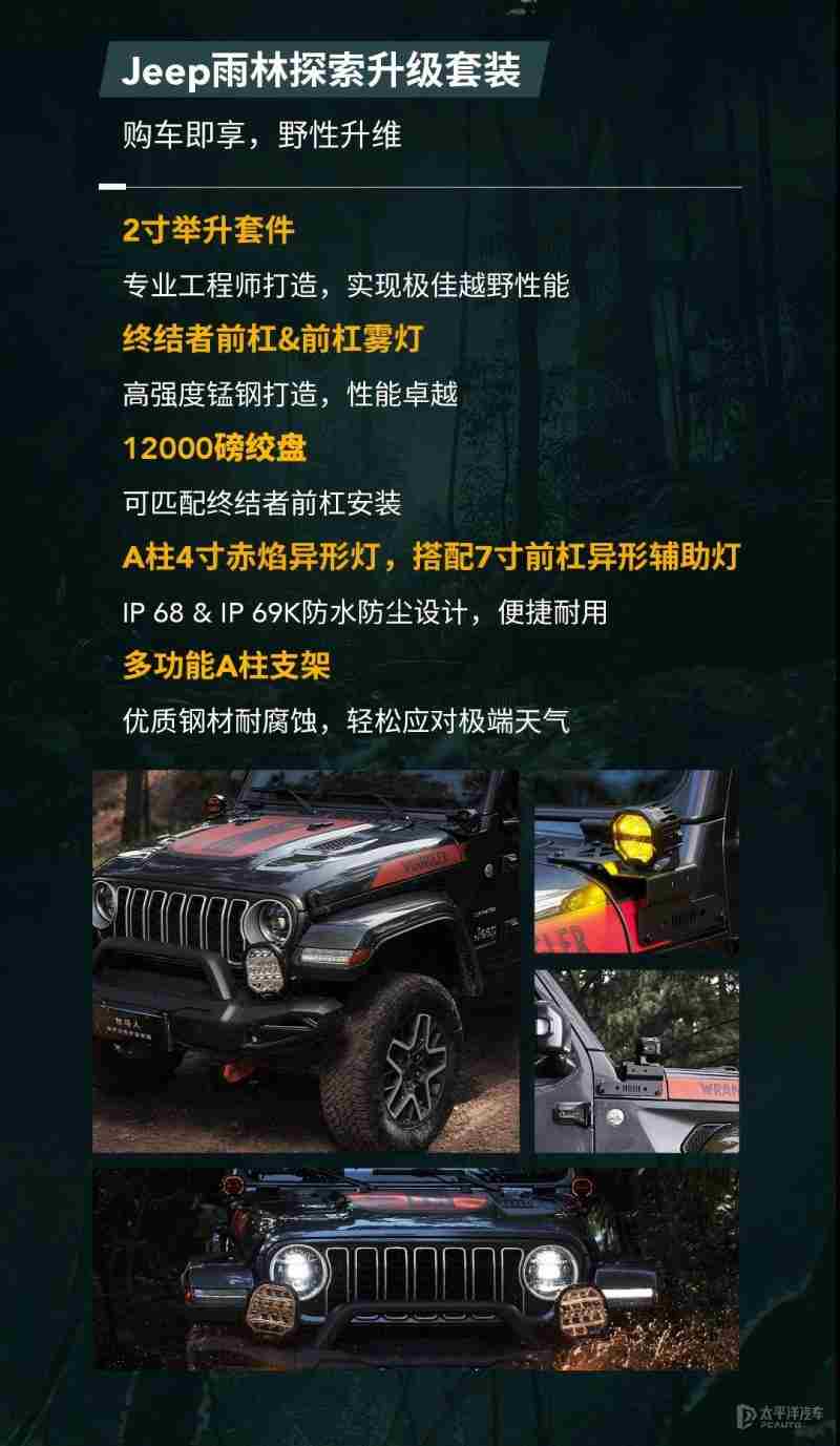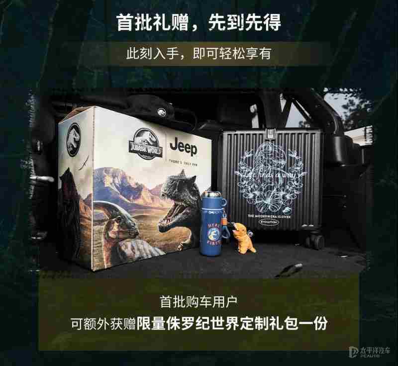 值得一提的是,购车可享Jeep雨林探索升级套装,包括2寸升举套件、终结者前杠/前杠雾灯、12000磅绞盘、A柱4寸赤焰异形灯、7寸前杠异形辅助灯、多功能A柱支架。此外,首批购车用户可额外获赠限量侏罗纪世界定制礼包一份。