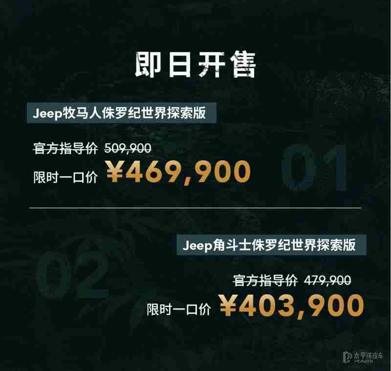 【太平洋汽车 新车频道】7月2日,Jeep正式推出牧马人(询底价|查参配)/角斗士侏罗纪世界探索版,牧马人侏罗纪世界探索版官方指导价50.99万元,限时一口价46.99万元,角斗士侏罗纪世界探索版官方指导价47.99万元,限时一口价40.39万元。