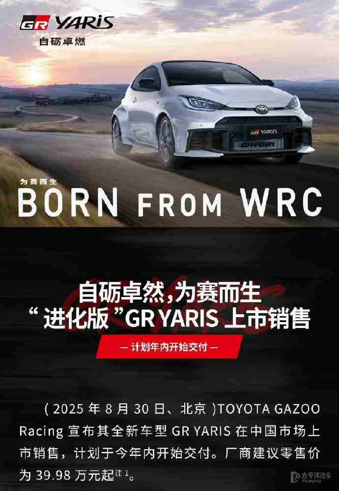 【太平洋汽车 新车频道】日前,丰田中国宣布新款GR YARIS正式在中国市场上市,售价39.98万元起,新车计划于今年内开始交付。新车针对底盘、避震、EPS电子转向助力系统调教等多方面都进行了升级优化,还可选装拉力赛车同款的立式手刹。