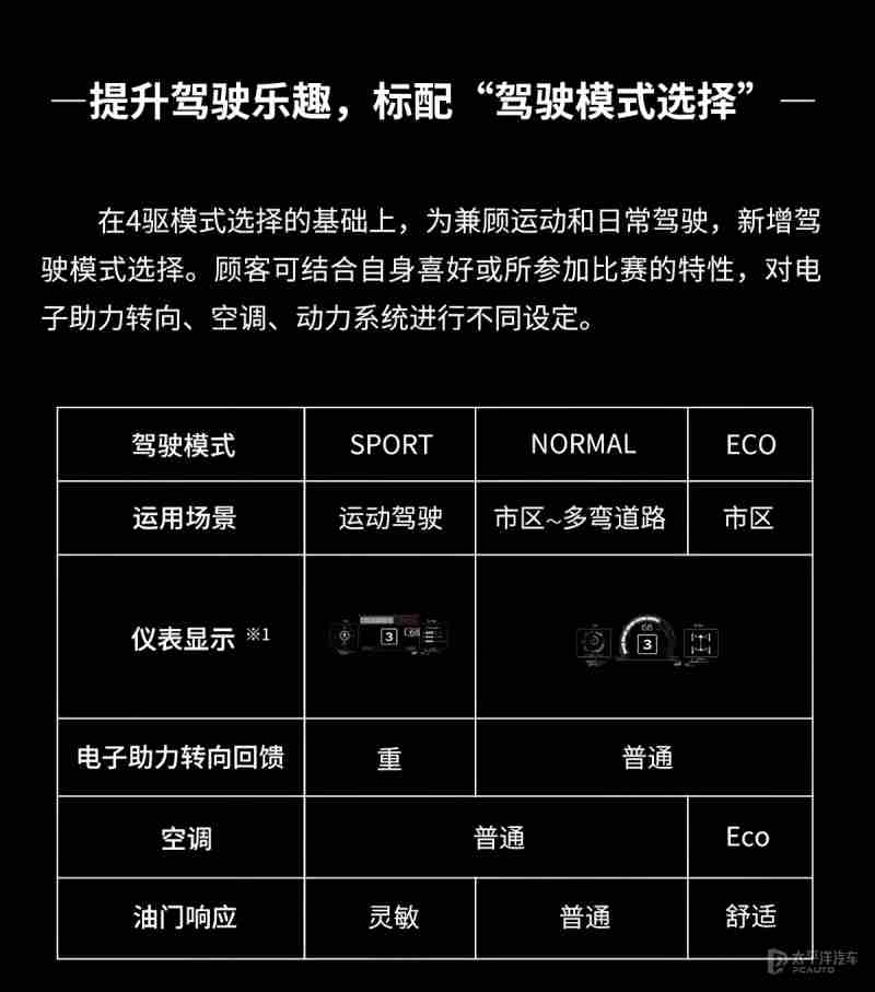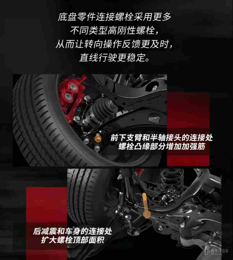 底盘方面,新车采用更多高强度螺栓,强化前下支臂、半轴接头、后副车架等连接处部件的零件强度,增加车身刚性的同时转向反馈更直接。