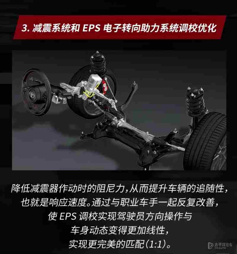 新车还优化了EPS电子转向助力系统的调校,让驾驶员方向操作和车身动态更加线性,可实现1:1的完美匹配。