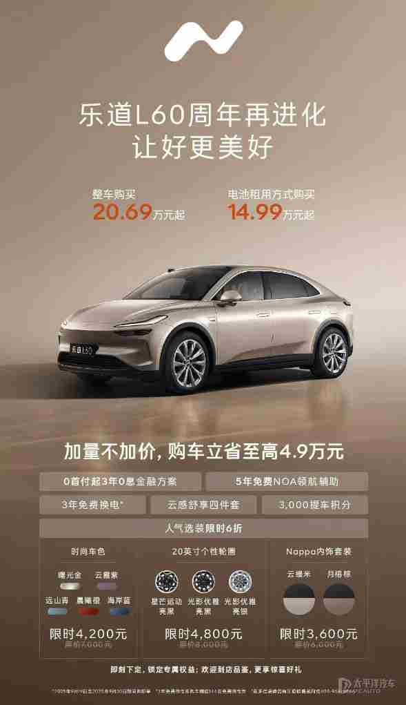 【太平洋汽车 新车频道】9月19日,新款乐道L60(询底价|查参配)正式上市,新车共推出4款车型,售价区间为20.69-25.59万元,采用电池租用方案购买价格为14.99万元起,将于10月下旬开启交付。作为改款车型,新款乐道L60主要对配置、能耗和续航进行优化,新增曙光金外观配色、月榕棕和云缦米内饰颜色,全系基于900V平台打造,提供单电机后驱和双电机四驱可选,CLTC纯电续航最高740km,百公里能耗低至11.9千瓦时。