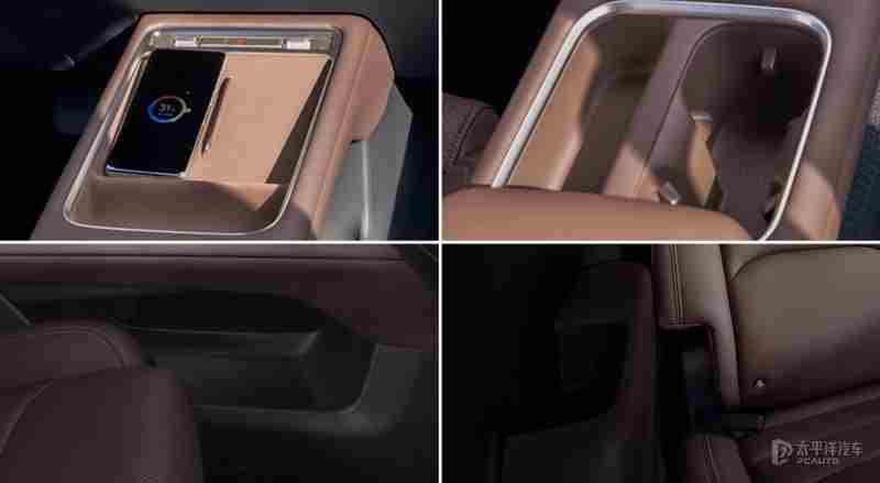 此外,全车设有25处人性化储物空间,包括贯穿式储物盒、前中后排杯托、前排地图袋、后排储物盒、左右衣帽钩,还配备支持50W无线快充的专属手机台。