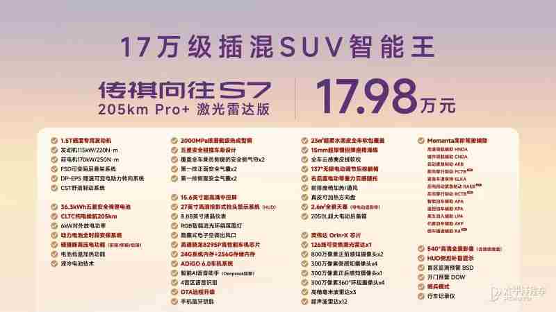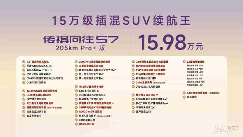 作为了解,传祺向往S7 PRO+基于广汽全新EV+新能源平台打造,定位中大型插混SUV,搭载1.5T插混系统,配备智能四驱系统,零百加速7.9秒,综合续航1150km,并标配可变阻尼悬架,内置有高通骁龙8295P芯片。
