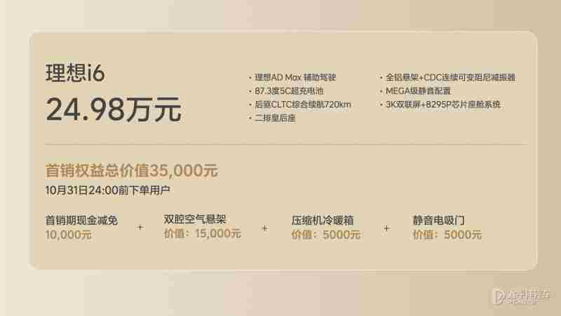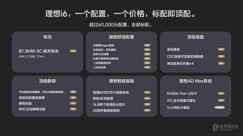 配置层面,理想i6标配9安全气囊、全景天幕、前后双层隔音玻璃、后排手动遮阳帘、后排侧隐私玻璃、方向盘加热、16.3英寸HUD抬头显示、50W手机无线充电、前排座椅加热/通风/按摩、后排座椅加热/通风、20扬声器音响、256色氛围灯、后排独立空调出风口等,同时,首销期还免费赠送车载冰箱、电吸门和双腔空气悬架,并可选装21.4英寸后排娱乐屏和流媒体内后视镜(1万元)等。