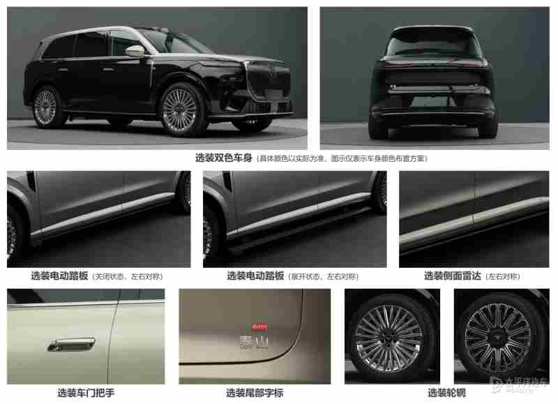 车尾部分,岚图泰山造型风格相比前脸要简洁和低调,采用主流的贯穿式尾灯组设计,提升了车尾的视觉宽度。此外,新车还提供双色车身、电动踏板、门把手、轮毂、尾部字标等选装。