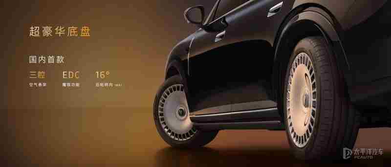 底盘方面,岚图泰山采用前双叉臂式后五连杆式独立悬架的形式,并配备三腔空气悬架、EDC魔毯功能和双向16度后轮转向系统,可实现5.4米转弯半径。