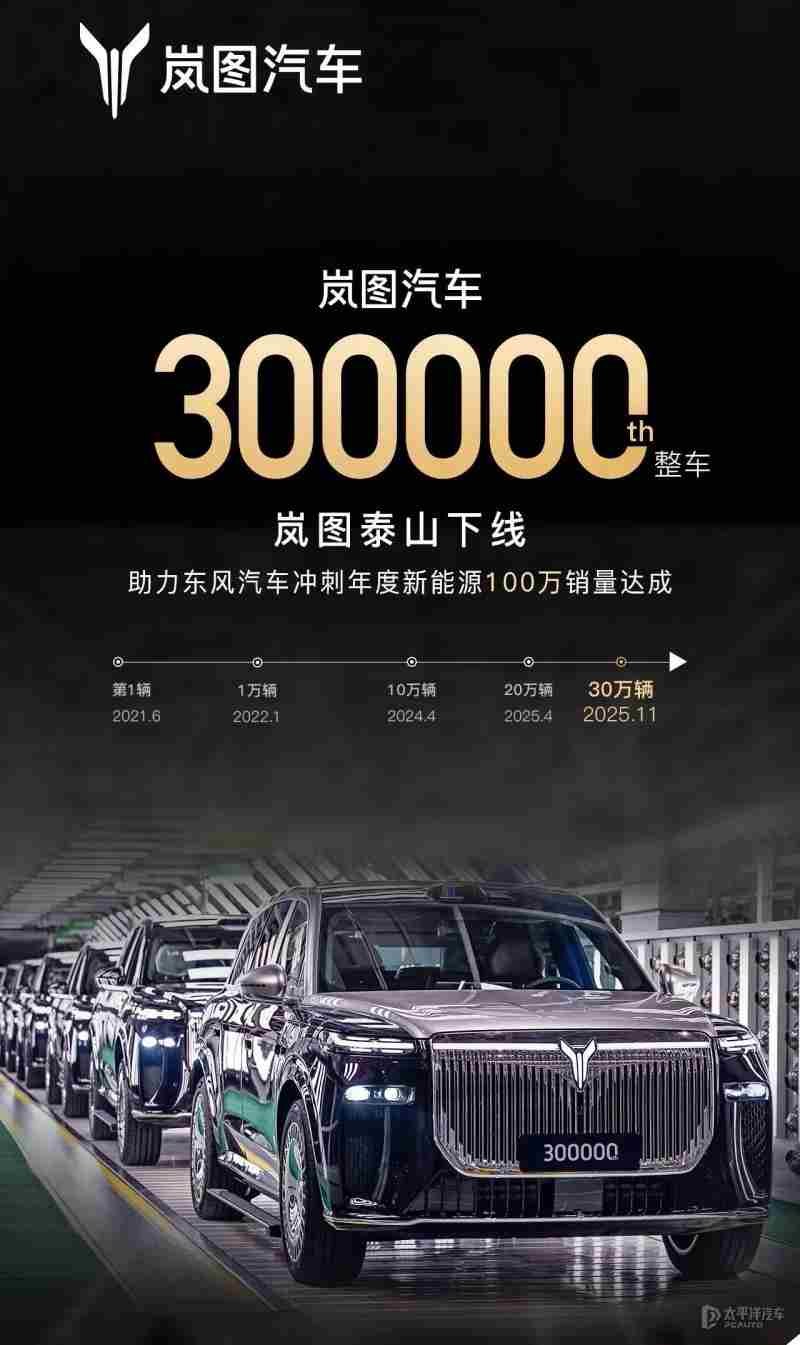 【太平洋汽车 新车频道】11月10日,岚图汽车迎来第30万台整车下线,下线车型为岚图泰山(询底价|查参配),其将于11月18日正式上市。作为了解,岚图汽车从2021年6月开始下线首款车型,7个月后下线车型突破过万;2024年4月迎来第10万台车下线,2025年4月迎来第20万台车下线,如今仅用时7个月迎来第30万台整车下线。