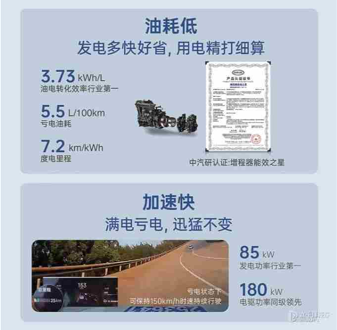 增程版车型则搭载由1.5L发动机组成的星源增程系统,其1.5L发动机最大功率74千瓦,驱动电机提供最大功率150千瓦和165千瓦两种版本可选,馈电油耗5.5L/100km,匹配容量为29.165千瓦时的磷酸铁锂电池组,CLTC纯电续航210km,支持3C快充,SOC 30%-80%仅需15分钟。