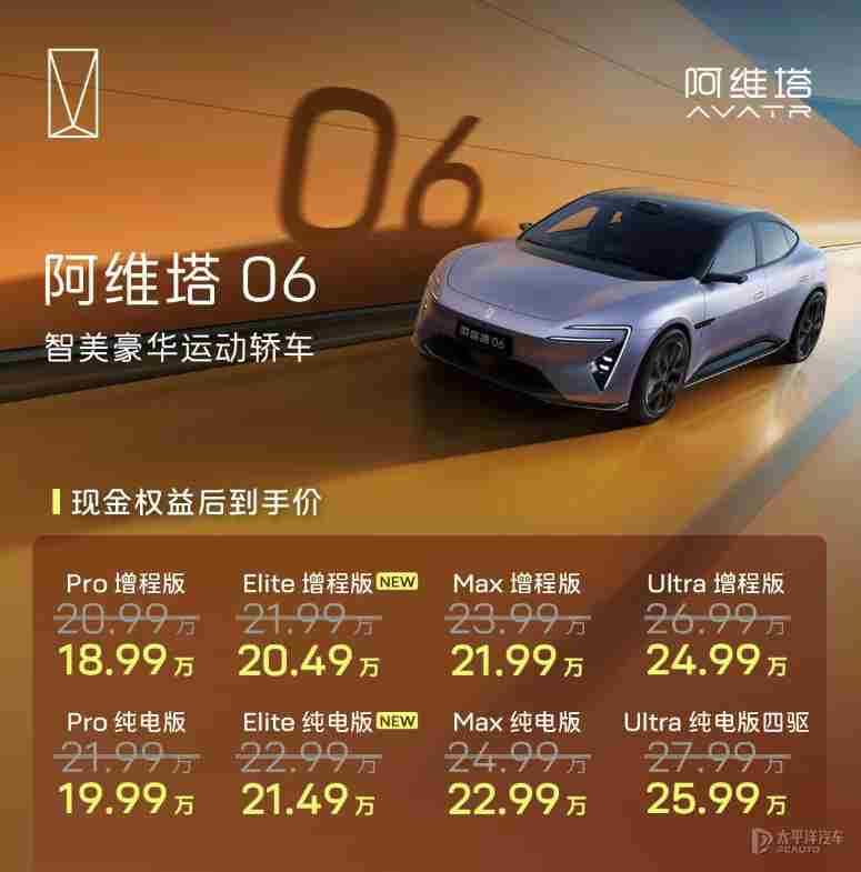 【太平洋汽车 新车频道】11月3日,阿维塔06 Elite上市,新车共推出2款车型,售价区间为21.99-22.99万元,现金权益后售价20.49-21.49万元。作为新增车型,新车在Pro版配置基础上增加一颗华为192线激光雷达,并标配华为乾崑ADS 4与鸿蒙座舱HarmonySpace 5,继续纯电和增程动力选择,其中增程版搭载1.5T增程器,CLTC纯电续航330km,纯电版CLTC续航最高650km。