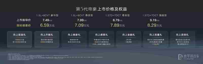 【太平洋汽车 新车频道】11月18日,吉利第5代帝豪正式上市,共推出4款车型,售价区间为7.49-9.19万元,限时感恩价区间为6.59-8.29万元。新车是新一代BMA Evo全球模块化架构打造的首款车型,采用全新外观内饰设计,车身尺寸进一步升级,引入Flyme Auto智能座舱,搭载1.5TD发动机+7DCT变速箱动力组合,官方百公里加速成绩7.9秒。
