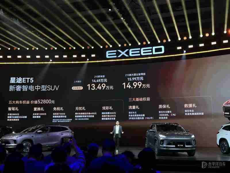 【太平洋汽车 新车频道】11月28日,星途ET5正式上市,新车共推出2款车型,官方指导价为14.49-15.99万元,超级置换价为13.49-14.99万元。作为星途品牌全新SUV,星途ET5(询底价|查参配)定位中型SUV,搭载1.5T增程混动系统,CLTC纯电续航210km,CLTC综合续航1310km。同时,新车还搭载猎鹰700驾驶辅助系统,首发地平线征程6P旗舰芯片(算力560 TOPS),支持高速/城市领航辅助驾驶等功能。