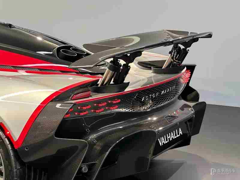 车尾方面,阿斯顿·马丁Valhalla量产版摒弃了固定翼设计,配备超大尺寸扰流板,其角度也可随车速调整,类似于F1赛车开启“DRS”的原理,在车速达到240公里/小时时,可产生超过600公斤的下压力,随着车速提升至最高时速350公里/小时,主动空气动力学系统会逐步降低前后翼的“迎角”,“释放”多余的下压力,以维持下压力水平,最大限度地增强驾驶员的信心。同时,新车采用四出钛合金排气系统,一对排气管位于车顶,另一对排气管则位于车身底部通道两侧,其下置排气管由主动阀控制。